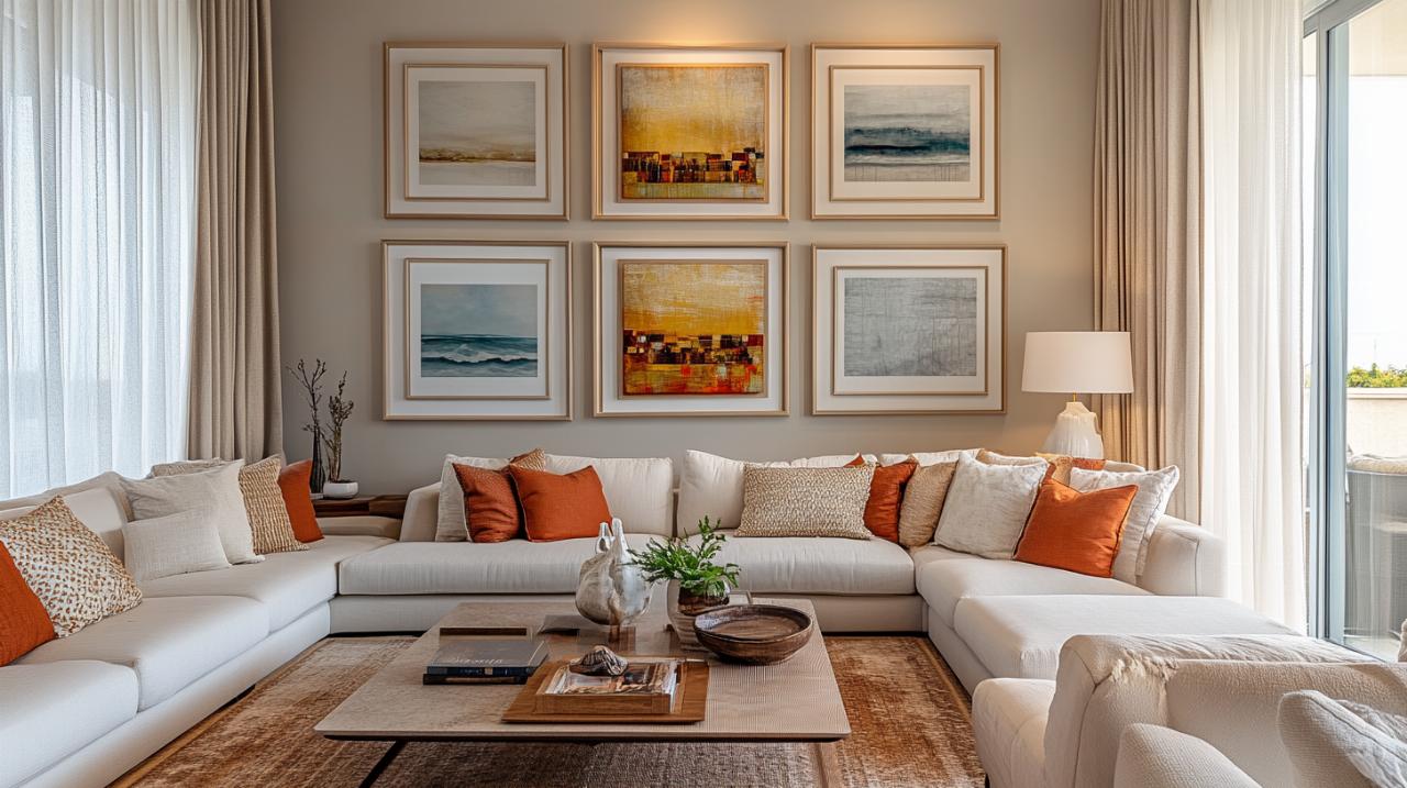 La relation entre votre composition murale et le mobilier environnant mérite également une attention particulière. Lorsque votre mur de cadres se trouve au-dessus d'un meuble, la composition devrait idéalement couvrir environ deux tiers de la largeur de ce meuble. Cette proportion crée un équilibre visuel harmonieux qui ancre l'ensemble dans l'espace. Si votre composition est trop étroite par rapport au meuble, elle paraîtra perdue et sans lien avec son support. Si elle déborde largement, elle créera une impression de déséquilibre et d'instabilité.